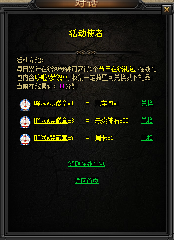 活动期间,每天累计在线30分钟即可领取【节日在线礼包】, 内含【哆啦A梦徽章】,集够一定数量可在活动使者处兑换礼品,每个玩家每天只能获取1个。