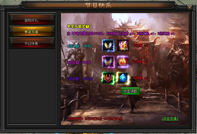 活动期间单笔充值满100元,500元,1000元可领取高级神翼,幻化石,觉醒神石等奖励。
