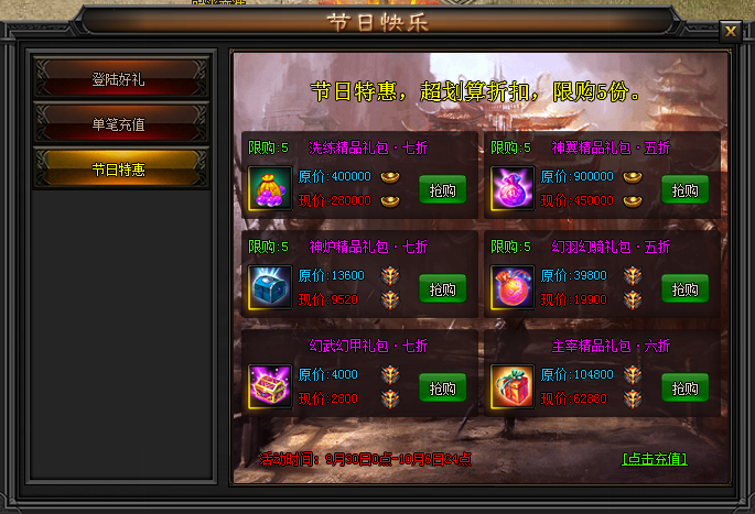 活动期间,超低折扣的活动礼包还同时间全面上架包括全力帮助您游戏更加舒畅开怀,可在页面右上角”节日活动”-节日特惠处购买特惠礼包,各种珍贵材料,道具限时出售,仅限活动期间购买,一定不要错过哦!