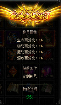 一、玩家累计充值(活动2天累计)达到20000RMB,可以自己选四至六个字-带特效定制称号,全属性增加1%。(定制称号在活动结束后统一提交制作,延后发放;活动期间,每个玩家仅能定制一个1%称号)