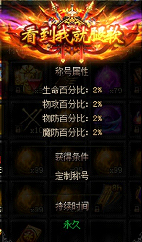 二、玩家累计充值(活动2天累计)达到30000RMB,可以自己选四至六个字-带特效定制称号,全属性增加2%。(定制称号在活动结束后统一提交制作,延后发放;活动期间,每个玩家仅能定制一个2%称号)