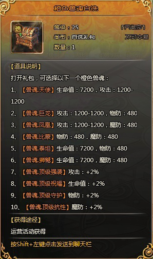 6、10000:5阶龙魂*1,100星XO兽礼包*200,兽魂重置石*200,橙色兽魂自选*2