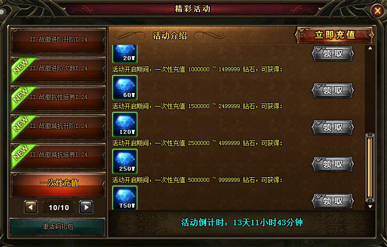 一、充值返利添加到游戏内,充值完成后玩家自行在【精彩活动】中领取。